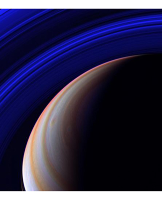 Fotografia infravermelha do hemisfério norte de Saturno tirada pela Cassini em 2007, a uma distância de cerca de 1,4 milhão de km. As cores artificiais usadas representam os químicos diferentes presentes na atmosfera.