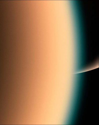 Imagem da lua Titã, a maior de Saturno. Por anos cientistas especularam o que teria abaixo das nuvens que a cobrem. Câmaras da sonda Huygens revelaram em 2005 dunas, montanhas e oceanos de óleo hidrocarbono em sua superfície.